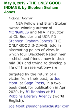 Can finally-finally say it without promising whoever I’m telling it to to secrecy, or to somehow post-date this info: sold two horror novels to Joe Monti at Saga! This is the outfit that did Rebecca Roanhorse’s Trail of Lightning. This is the imprint of Simon & Schuster that just moved to the Gallery Publishing Group, which used to be Pocket. This is the editor that, over the past month or so, pushed me to make what WAS Elk Head Woman, a slasher, into the new and improved, lean and mean: