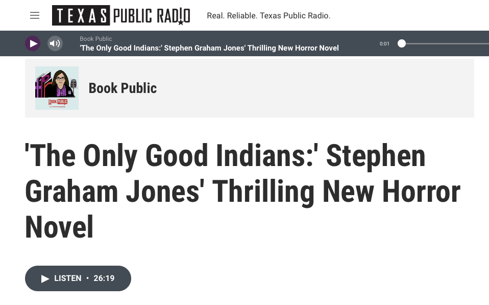 December 9, 2020December 9, 2020 https://therumpus.net/2020/12/the-rumpus-interview-with-stephen-graham-jones/ Stephen Graham Jones Battles Stereotypes and Serial Killers in His Breakout Novel https://www.tpr.org/podcast/book-public/2020-11-27/the-only-good-indians-stephen-graham-jones-thrilling-new-horror-novel https://twitter.com/WFTSisabel/status/1336133761621221377?s=20
