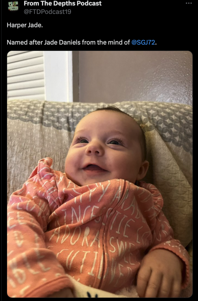 A Final Girl is Born December 19, 2023December 12, 2024 You’d think acclaim or sales would be the highest honor. Turns out? It’s this magic right here: Harper Jade. Named after Jade Daniels from the mind of @SGJ72. pic.twitter.com/LPAVxHKvr5— From The Depths Podcast (@FTDPodcast19) December 19, 2023 will put a screencap of the tweet below, in case X goes away: