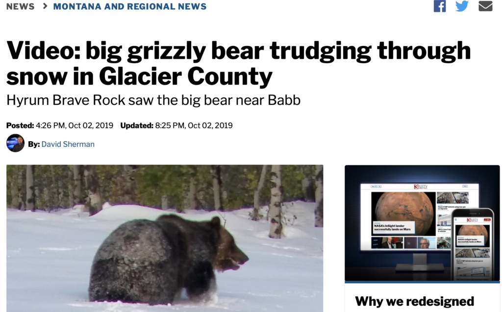 Best of 2019 so far: the November post November 1, 2019October 29, 2019 https://www.krtv.com/news/montana-and-regional-news/video-big-grizzly-bear-trudging-through-snow-in-glacier-county