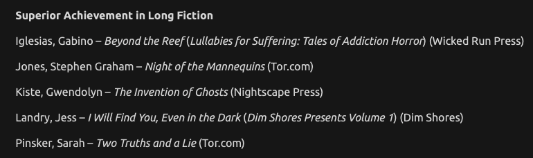 Bram Stoker Award Final Ballot! February 20, 2021February 20, 2021 SUCH an honor to have TWO works on this. Just to be alongside so many excellent writers, so many good stories. Luck to all.