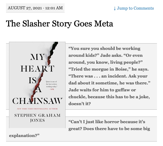 Chainsaw avalanche, part the sixth September 20, 2021September 20, 2021 https://cootsreviews.com/2021/08/27/the-slasher-goes-meta/ https://www.king5.com/article/entertainment/television/programs/new-day-northwest/books-fall-reading-fiction-nonfiction-thriller-romance-seattle-public-library/281-fe5f4406-ce17-4b73-a06f-32be8ffb54cd Here are the bestsellers at Southern California’s independent bookstores https://www.king5.com/article/entertainment/television/programs/new-day-northwest/books-fall-reading-fiction-nonfiction-thriller-romance-seattle-public-library/281-fe5f4406-ce17-4b73-a06f-32be8ffb54cd https://www.providencejournal.com/story/entertainment/arts/2021/09/17/jon-lands-picks-septembers-must-read-thrillers/8305451002/ #BookReview: My Heart is a Chainsaw by Stephen Graham Jones @TitanBooks #MyHeartisaChainsaw #damppebbles https://online.fliphtml5.com/suene/ncpp/#p=1 https://www.runalongtheshelves.net/blog/2021/9/18/my-heart-is-a-chainsaw-by-stephen-graham-jones The Slasher Story Goes Meta – My Heart is a Chainsaw by Stephen Graham Jones