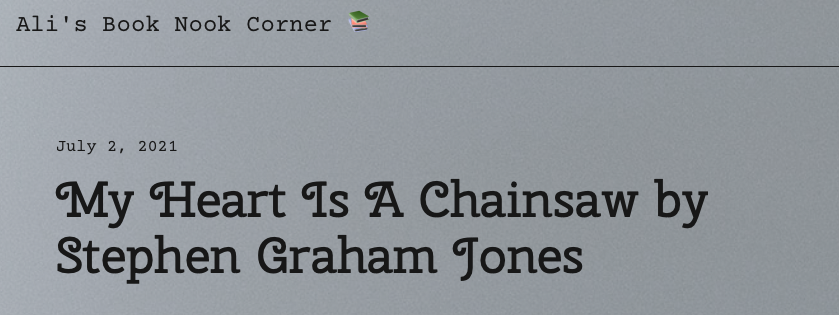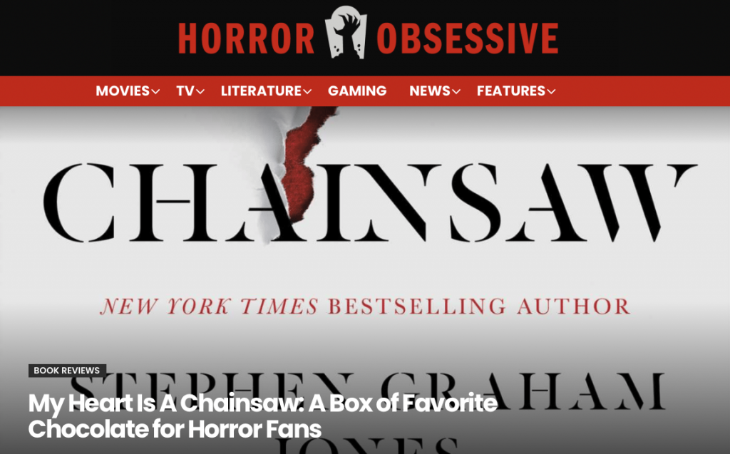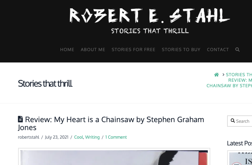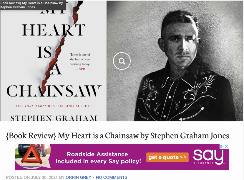 Chainsaw reviews, &etc August 1, 2021August 1, 2021 https://signalhorizon.com/book-review-my-heart-is-a-chainsaw-by-stephen-graham-jones/ Seems like a good time to post all these, since we’re now in the month My Heart is a Chainsaw comes out: https://suspensebookreviews.home.blog/2021/07/02/my-heart-is-a-chainsaw-by-stephen-graham-jones/ https://www.bookreporter.com/reviews/my-heart-is-a-chainsaw https://horrorobsessive.com/2021/07/06/my-heart-is-a-chainsaw-book-review/ https://www.thisishorror.co.uk/look-out-for-my-heart-is-a-chainsaw-by-stephen-graham-jones/ https://proseandpaperbacks.com/2021/05/29/my-heart-is-a-chainsaw/ https://kendraprestonleonard.hcommons.org/2021/04/09/reviews-horror-non-fiction-and-a-novel-in-verse/ https://theinkblotters.com/2021/07/22/book-review-my-heart-is-a-chainsaw-by-stephen-graham-jones/ https://robertestahl.com/review-my-heart-is-a-chainsaw-by-stephen-graham-jones/ https://susanmonroemcgrath.home.blog/2021/07/30/my-heart-is-a-chainsaw/ https://twitter.com/jesswitkins/status/1413239540966379520?s=20 Y'know how a LOT of horror stories stall the ending?The big bad fight gets overblown, or too abstruse, or it all ends in a lazy explosion?Well listen – genuinely – @SGJ72's MY HEART IS A CHAINSAW has one of the great endings in all of horror fiction. It's astonishing. pic.twitter.com/WdbC545uUb— Talking Scared Podcast (@TalkScaredPod) July 12, 2021