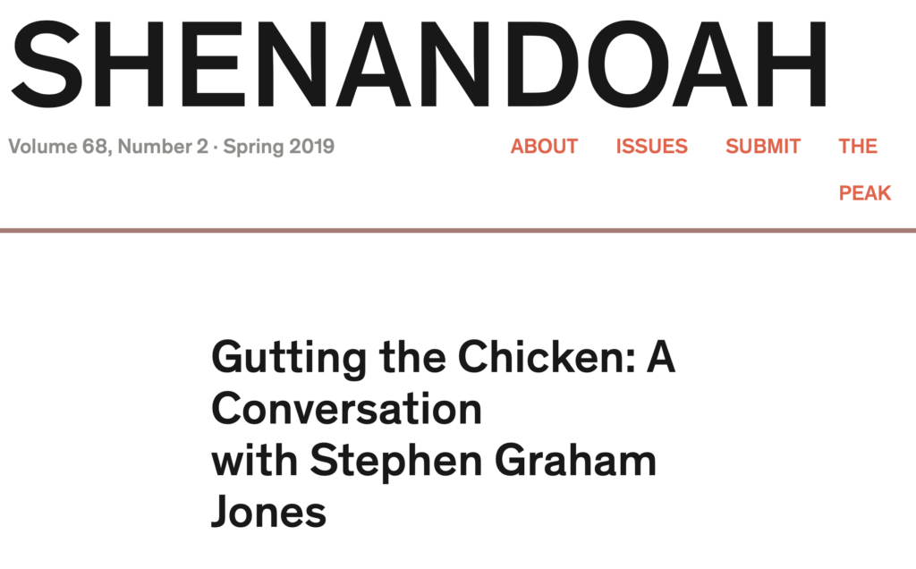 “Chicken” story up at Shenandoah May 10, 2019May 10, 2019 Along with an interview about the story: https://shenandoahliterary.org/682/gutting-the-chicken/