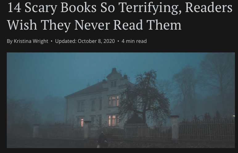 Couple Elky Lists October 11, 2020October 11, 2020 Bookriot: https://bookriot.com/folk-horror-books/ Bookbub https://www.bookbub.com/blog/scary-books-terrify-reader-blurbs