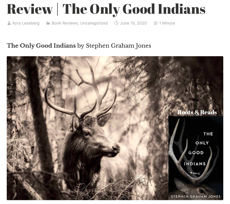 Couple More Elky Reviews June 20, 2020June 20, 2020 https://rootsandreads.wordpress.com/2020/06/15/review-the-only-good-indians/ http://bewarethescarylibrarian.blogspot.com/2020/06/new-arrival-only-good-indians-by.html