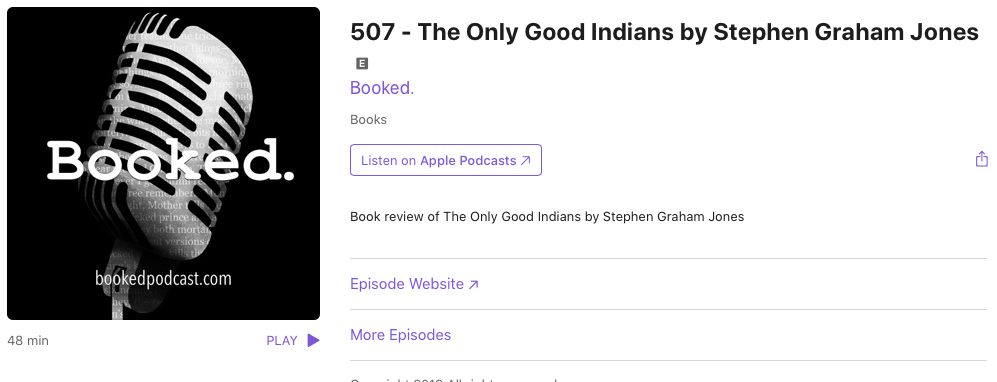 Couple more elky reviews July 31, 2020July 31, 2020 One a podcast: https://podcasts.apple.com/us/podcast/507-the-only-good-indians-by-stephen-graham-jones/id433583347?i=1000486385911 One a video: