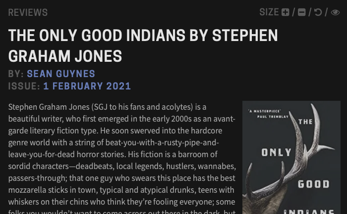 Couple of Elky Write-ups February 7, 2021February 7, 2021 https://youtu.be/TZooaFEhmgY Strange Horizons: http://strangehorizons.com/non-fiction/reviews/the-only-good-indians-by-stephen-graham-jones/
