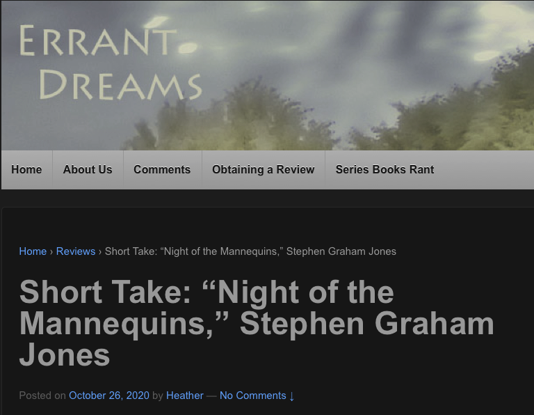 Couple of Mannequin-y write-ups January 11, 2021January 11, 2021 http://davidagranoff.blogspot.com/2020/12/book-review-night-of-mannequins-by.html http://www.errantdreams.com/2020/10/short-take-night-of-the-mannequins-stephen-graham-jones/