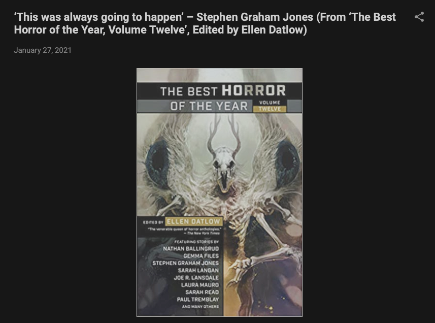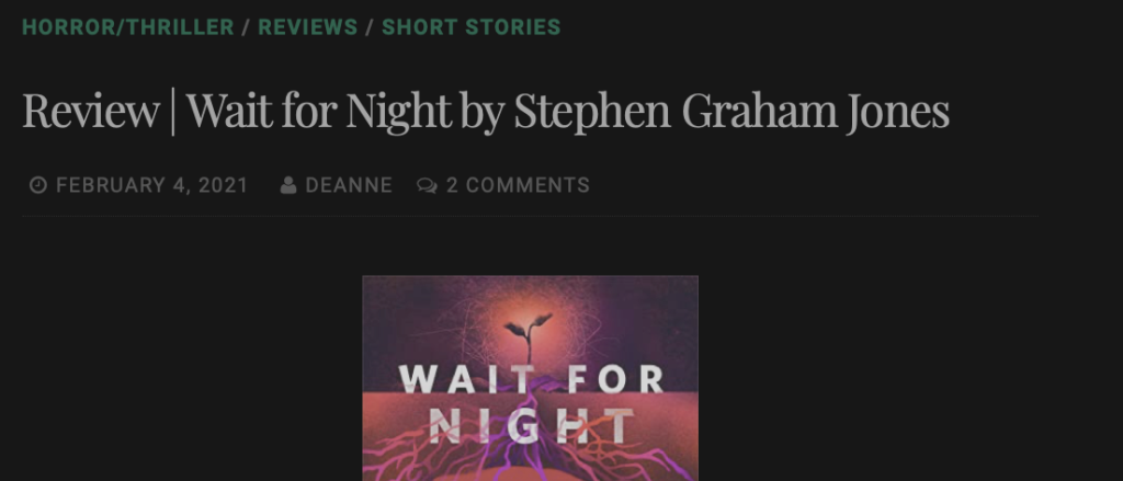 Couple of story reviews February 7, 2021February 7, 2021 https://thewanderingwordsmithblog.com/2021/02/04/review-wait-for-night-by-stephen-graham-jones/ https://lordsamperlibrary.blogspot.com/2021/01/this-was-always-going-to-happen-stephen.html