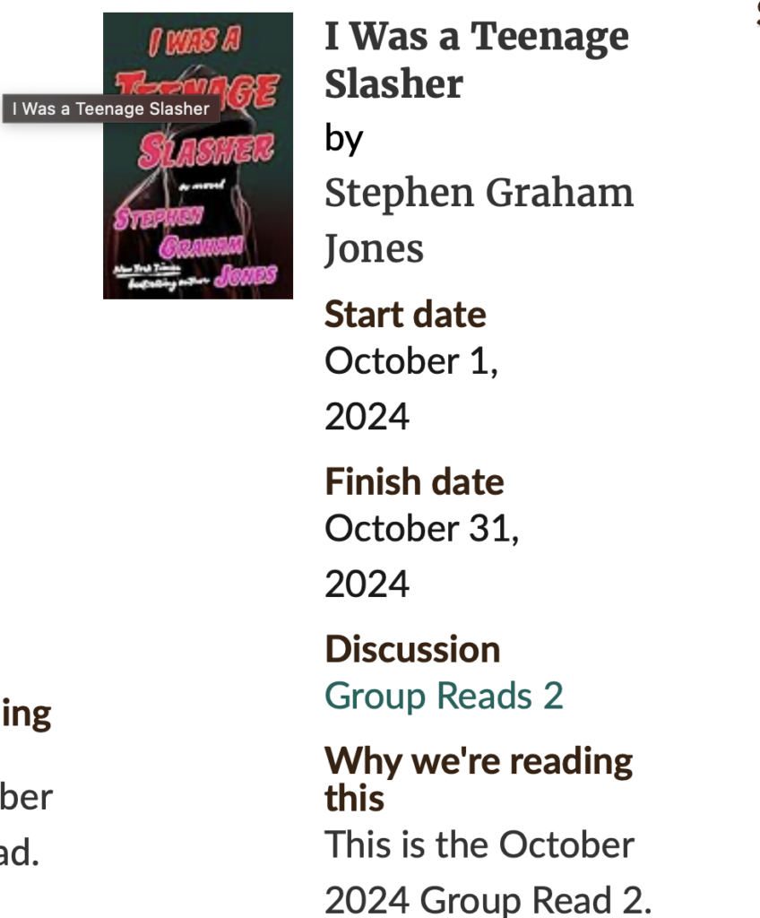 Couple of upcoming book clubs October 6, 2024December 9, 2024 https://telluridelibrary.libcal.com/event/12957656 https://www.goodreads.com/group/show/1240569-splatterpunk