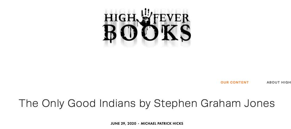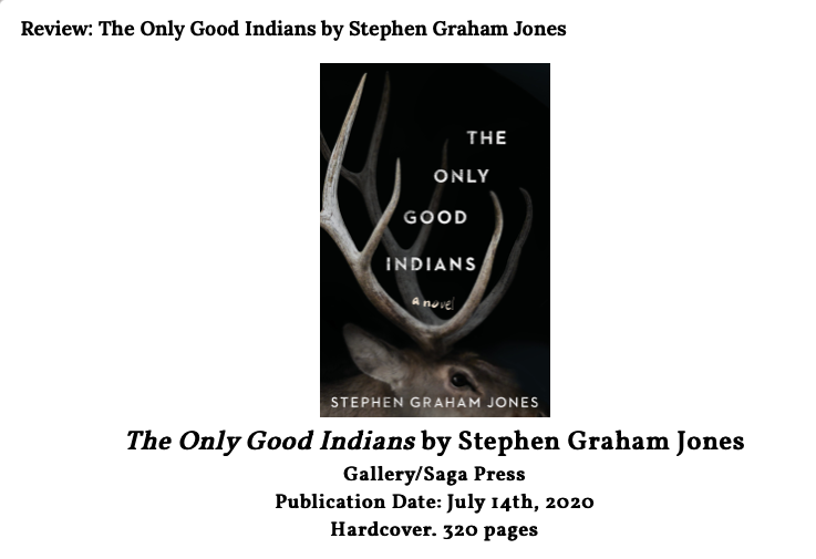 Couple-Three Elky Reviews July 3, 2020July 3, 2020 http://www.foreverlostinliterature.com/2020/07/review-only-good-indians-by-stephen.html https://thereviewbooth.wordpress.com/2020/06/30/the-only-good-indians/ https://www.highfeverbooks.com/reviews/the-only-good-indians-by-stephen-graham-jones