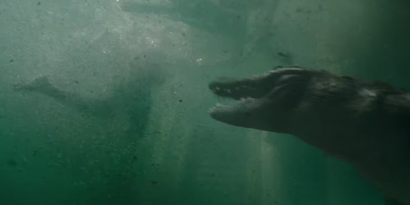 → first, since this is horror, it needs a blood sacrifice, yes? I’d start at the alligator farm, of course. some tourist or worker falls in, gets chomped by this big gator some wrangler just delivered, and then somebody ELSE says, “Man, rain’s coming on hard, yeah? Hope this pen holds,” something like that, at which point THEN cut to swim practice, proceed as-is, get that emotional father/daughter arc going