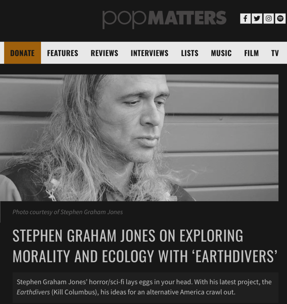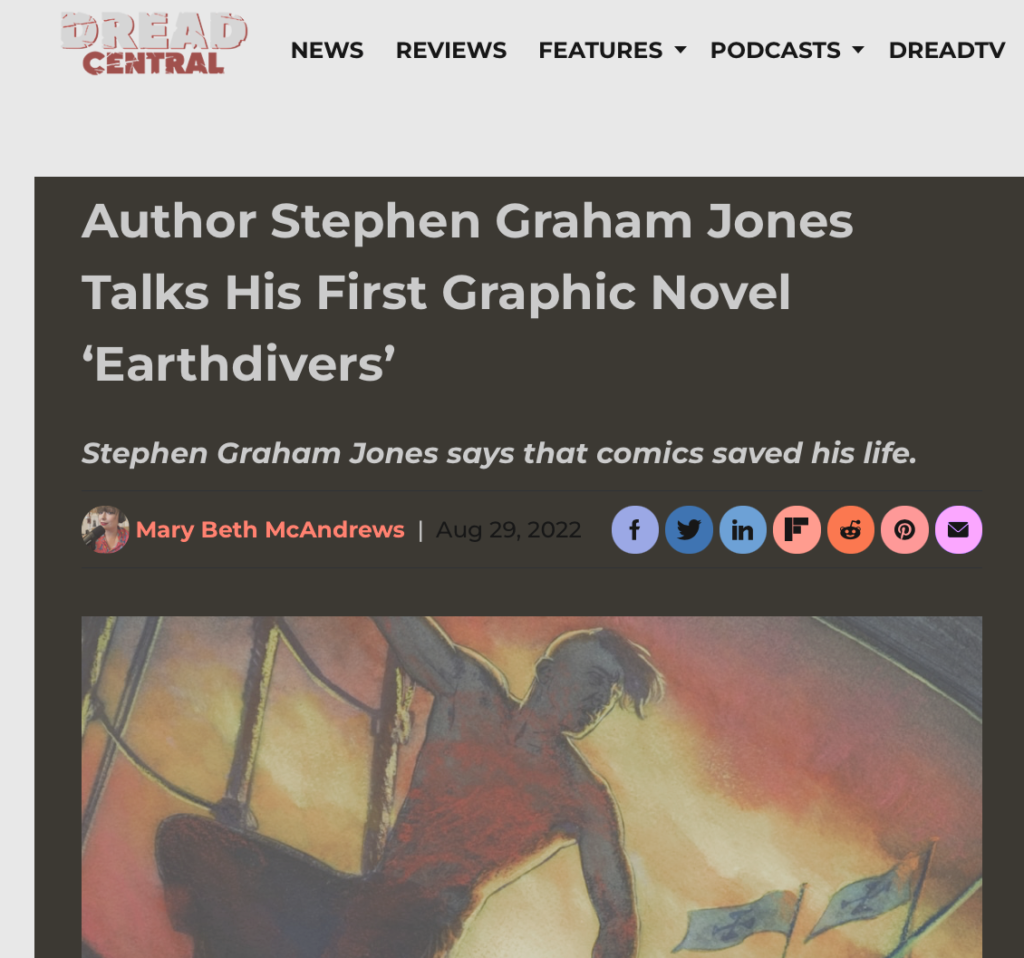 Earthdivers blurbs & more interviews August 29, 2022November 11, 2022 https://www.popmatters.com/stephen-graham-jones-earthdivers-interview Smash Pages Q&A | Stephen Graham Jones on ‘Earthdivers’ Horror Visionary Stephen Graham Jones Premieres Historical Slasher Earthdivers in October https://www.dreadcentral.com/news/436279/stephen-graham-jones-interview-first-graphic-novel-earthdivers/