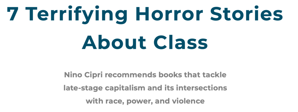 ElecLit book list March 7, 2020March 7, 2020 Pretty excellent one. Lucky to have sneaked on: https://electricliterature.com/7-terrifying-horror-stories-about-class/