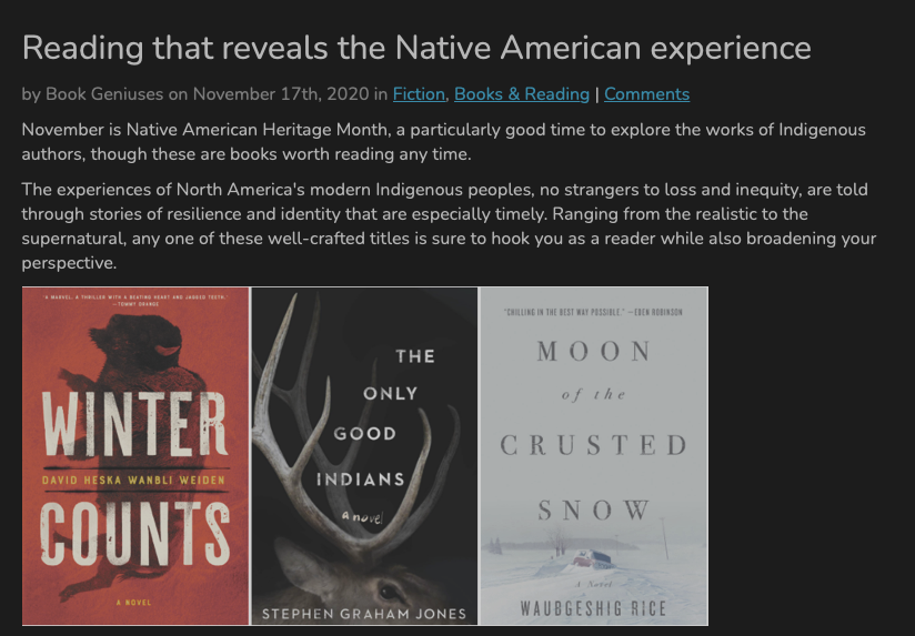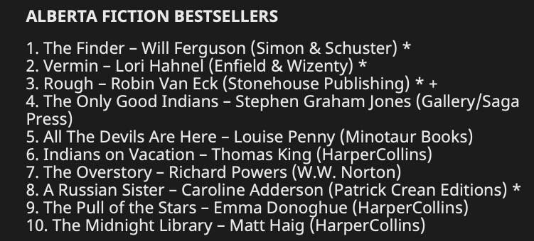 Elky stuff November 20, 2020November 20, 2020 Last day to vote in this, I believe: https://www.goodreads.com/choiceawards/best-horror-books-2020 Means a lot to be a bestseller up in the good country: https://albertapolitics.ca/2020/11/the-finder-by-alberta-author-will-ferguson-tops-independent-bookshops-fiction-bestseller-list/ https://electricliterature.com/11-books-about-midwesterners-who-arent-trying-to-be-nice/ https://guides.vapld.info/readers/blog/Reading-that-reveals-the-Native-American-experience https://www.publishersweekly.com/pw/by-topic/industry-news/trade-shows-events/article/84866-how-the-only-good-indians-got-made-and-how-it-hopes-to-revive-horror.html @stephanierabig First book review here! Stephen Graham Jones’s “The Only Good Indians”.#60secondbookreview #booktok #horrornovel #horror ♬ original sound – Stephanie Rabig (no clue if this embed’ll work . . . )
