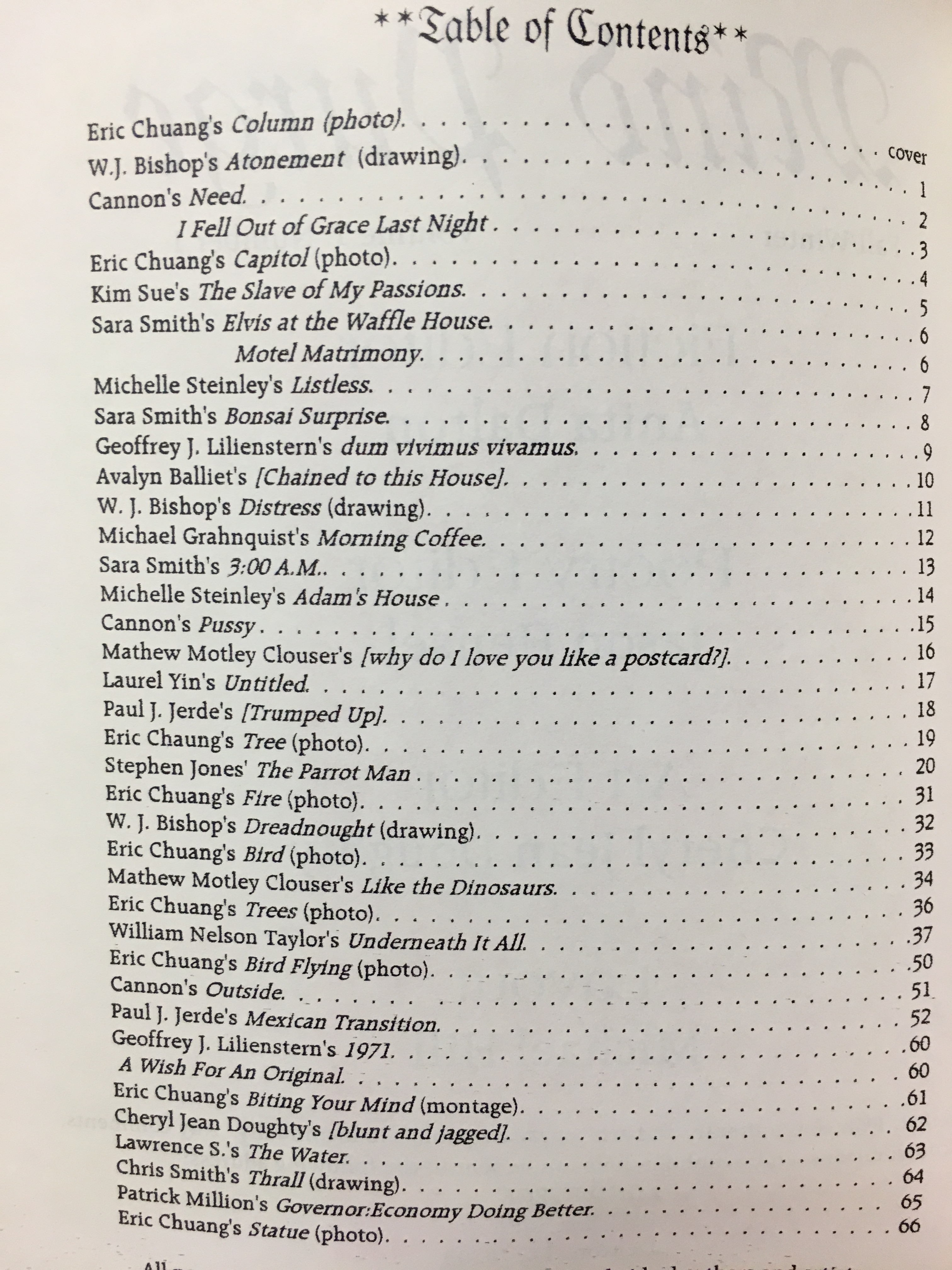 Digging through some old boxes, stumbled onto this little pamphlet. Way I remember my first reading, it was for this story “West Texas Dirt” I’d won an award for, in 1994, the last year of my undergrad work at Texas Tech. I guess I must have done this one too, though—with a friend I’d go onto MA-land with, Ashley.