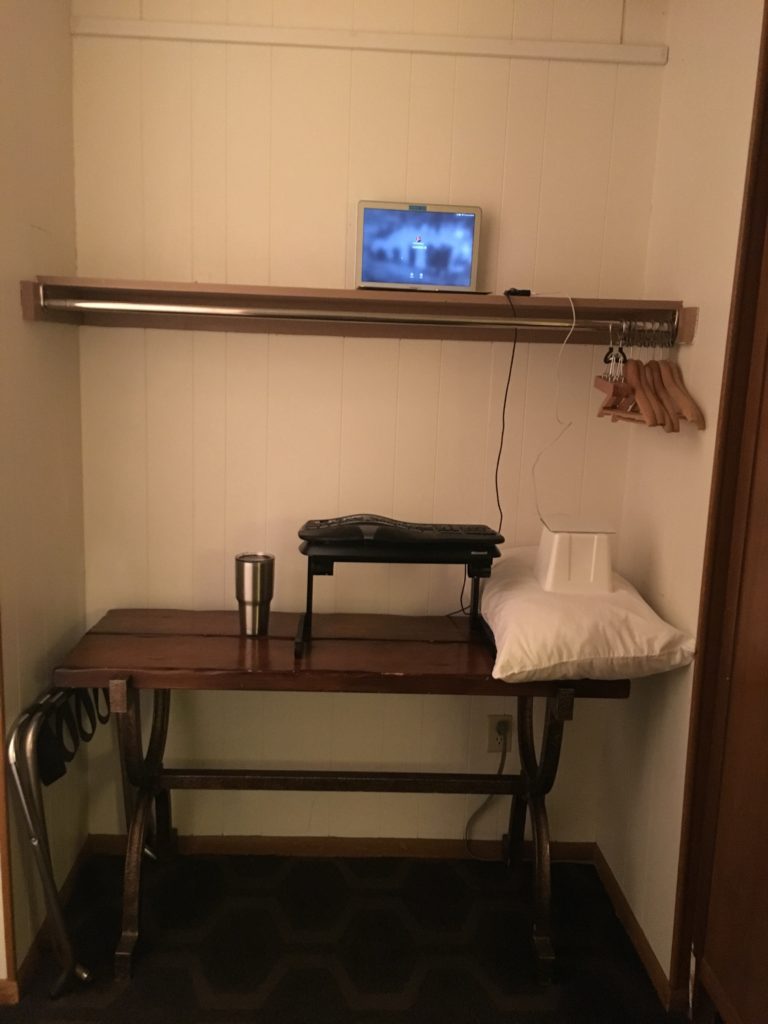 Oh, too: managed to write a chapter and a half of the right-now novel while there—I mean, it was a writing retreat—and at one of the cooler standing desks I’ve cobbled together in a hotel room: