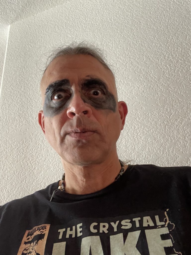 Halloween 2023 October 31, 2023December 12, 2024 Wife wasn’t in town to do fancy make-up for me like usual, so had to fall back on an old standard. In stages: Was fun walking around campus, catching looks from the undergrads like, Geez, grow up already?
