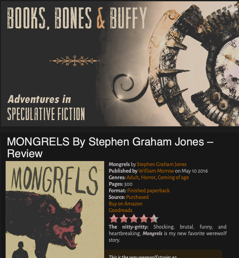 Halloween November 5, 2020November 5, 2020 is better with werewolves: https://booksbonesbuffy.com/2020/10/29/mongrels-by-stephen-graham-jones-review/ https://twitter.com/mferrara77/status/1322654263319896068?s=21 https://twitter.com/krpeterson77/status/1322968434477539329?s=21 https://twitter.com/spookybitchesbc/status/1322986921950404611?s=21
