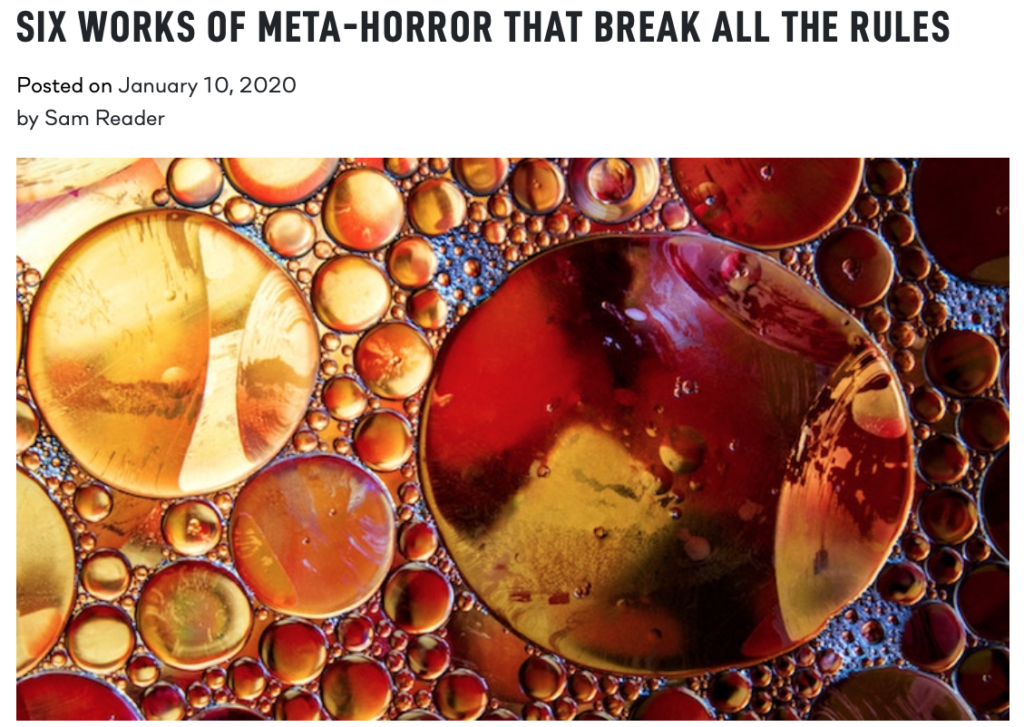 How Meta Can We Get? January 13, 2020January 13, 2020 Pretty meta, I’d say. Proud to have a final girl on this excellent Nightfire list: https://tornightfire.com/six-works-of-meta-horror-that-break-all-the-rules/