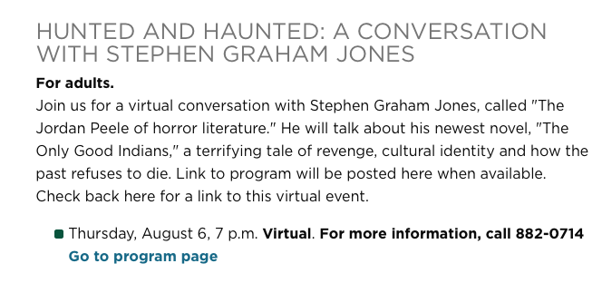 Hunted and Haunted August 2, 2020August 2, 2020 Best The Only Good Indians event-name so far. I’m doing it Thursday: https://thelibrary.org/programs/program.cfm?id=442382637292
