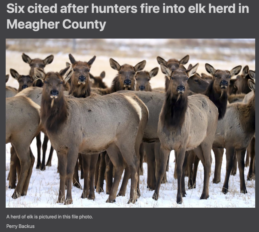 If they’d read Good Indians . . . October 29, 2020October 29, 2020 They’d know better than this. Also: hunting in a group of ONE HUNDRED? This must have been a battle zone, man: https://helenair.com/news/local/six-cited-after-hunters-fire-into-elk-herd-in-meagher-county/article_13a375f9-5993-5ba7-9cba-8861e02590fc.html