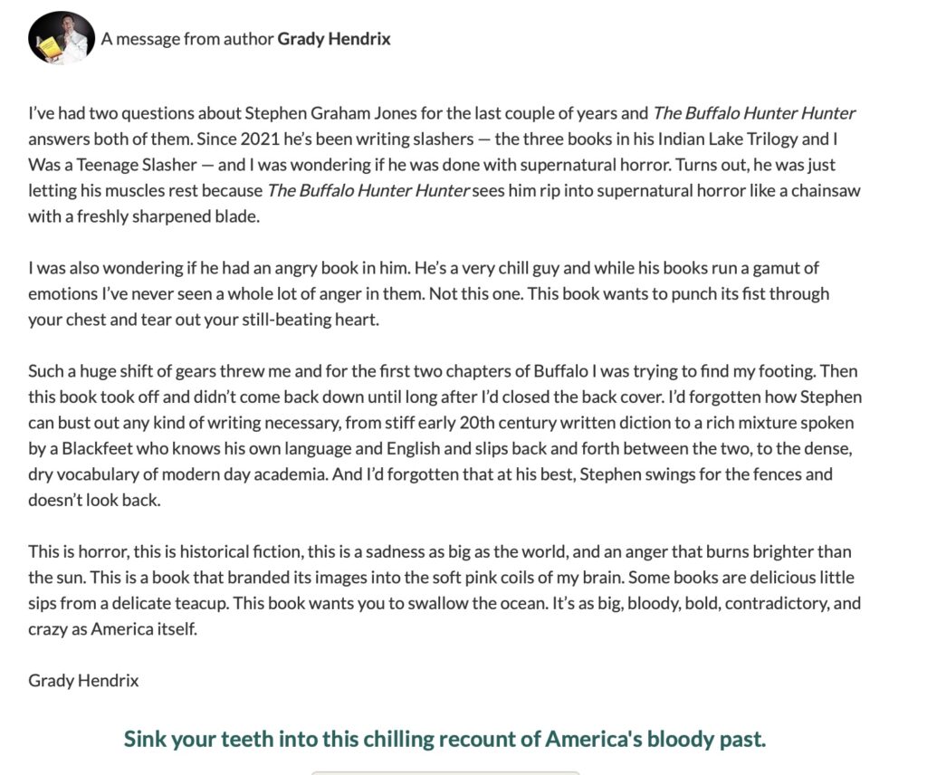 P.S. While I read in the acknowledgements section how you came to the title, and while I agree The Buffalo Hunter Hunter is a great title, I have also been calling it The Buffalo Hunter Hunter, or The Gospel of Good Stab, because how could I not. Hats off to you sir. Amazing.