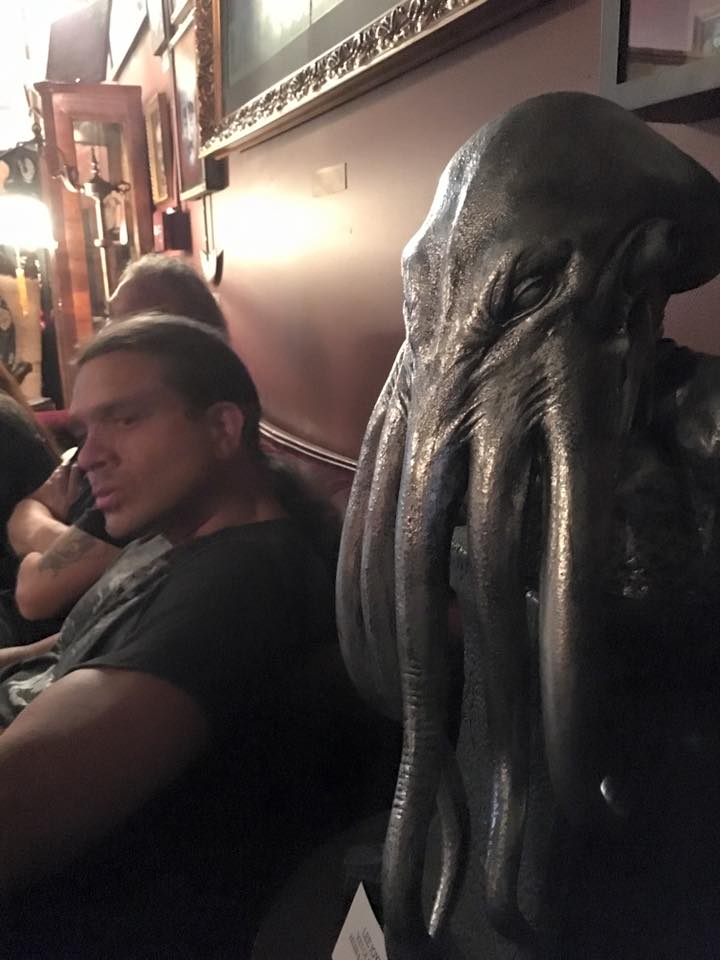 And? There’s a string of pics of me actually reading, but I can’t remember who took them, or where they posted, so: maybe I’ll sneak them in here some fine day? These pics, they were largely from Paul Tremblay, who also caught Cthulhu and me, gazing into the same old abyss as always: