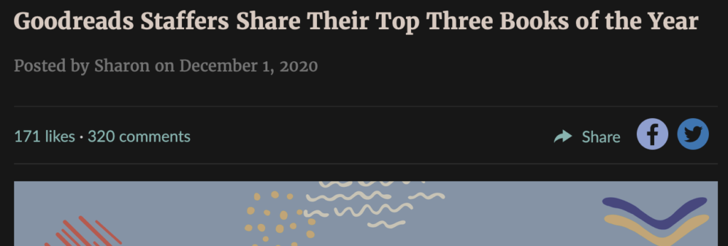 More elky lists December 29, 2020December 29, 2020 https://www.buzzfeednews.com/article/ariannarebolini/best-audiobooks-2020-librofm https://www.goodreads.com/blog/show/1945-goodreads-staffers-share-their-top-three-books-of-the-year Episode 84: Best of 2020 with Rachel Best Books of 2020 https://www.plough.com/en/topics/culture/literature/book-tour-circles-of-knowledge-and-ignorance The Top Literature and Culture Books of 2020 Our Favorite Content of 2020