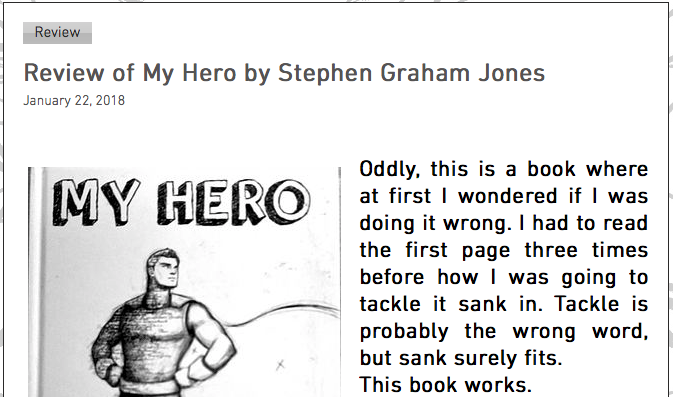 My Hero write-up January 23, 2018 Over at Unnerving: https://www.unnervingmagazine.com/single-post/2018/01/22/Review-of-My-Hero-by-Stephen-Graham-Jones