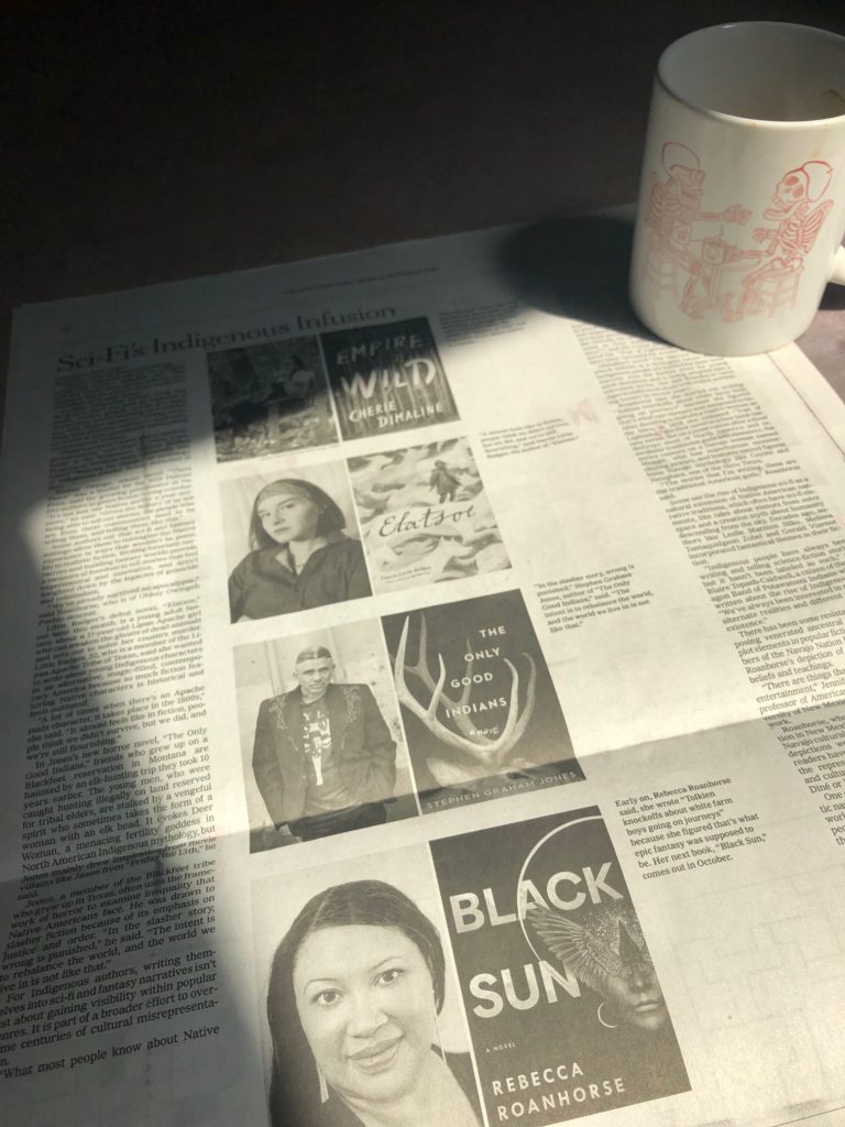 NYT piece August 18, 2020August 18, 2020 Just seeing the physical edition . . . sort of. Front page of the Arts section, very cool: https://www.nytimes.com/2020/08/14/books/indigenous-native-american-sci-fi-horror.html