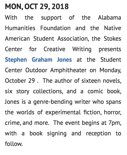 Oh, and I’m a doing a zombie talk as well, and I’m at Southern Alabama on the 29th, reading and visiting: