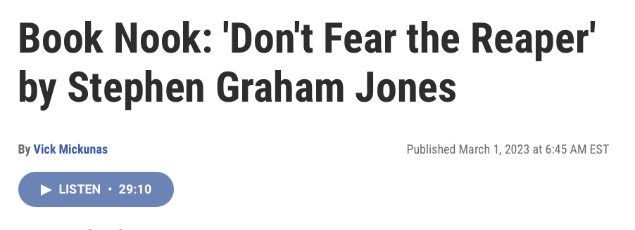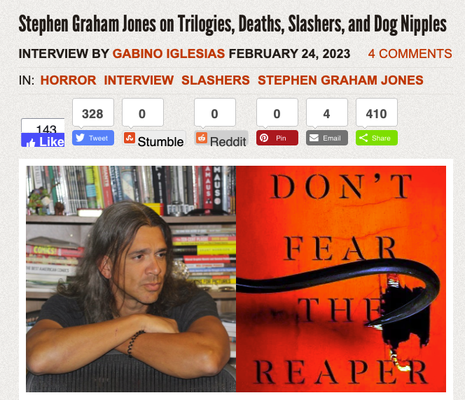 Recent interviews, podcasts, videos, etc March 5, 2023December 12, 2024 https://www.wyso.org/podcast/book-nook/2023-03-01/book-nook-dont-fear-the-reaper-by-stephen-graham-jones https://litreactor.com/interviews/stephen-graham-jones-on-trilogies-deaths-slashers-and-dog-nipples https://boulderweekly.com/entertainment/books/slashing-the-slasher/