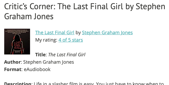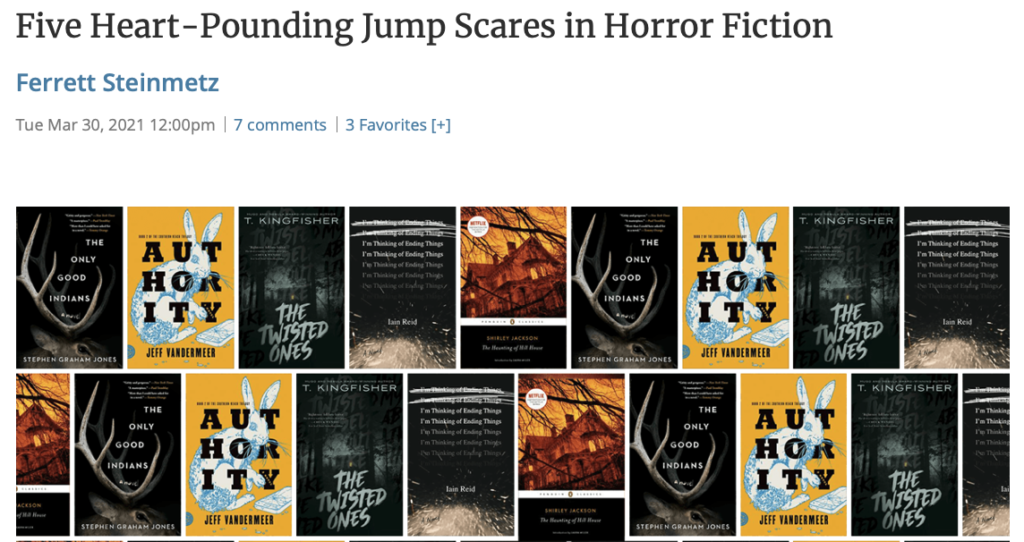 Review etc roundup: Mongrels, Elk, Slashers, Toilets… April 4, 2021April 4, 2021 https://www.tor.com/2021/03/30/five-heart-pounding-jump-scares-in-horror-fiction/ https://bottlesofale.com/2021/04/03/you-mess-with-the-mother/ https://www.instagram.com/p/CM_T3XrLptj/ https://liberiangirlpyt.wordpress.com/2021/03/26/critics-corner-the-last-final-girl-by-stephen-graham-jones/ https://consideringstories.wordpress.com/2021/04/01/flushboy/