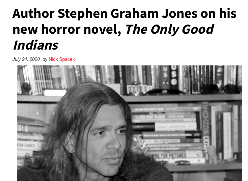 Saturday elky round-up July 25, 2020July 25, 2020 A review: https://simeontsanev.com/review-the-only-good-indians/#.XxyC5i2z3UK An Interview: https://www.thepitchkc.com/author-stephen-graham-jones-on-his-new-horror-novel-the-only-good-indians/ A bookstore shout-out And the coolest tweet/video EVER: @SGJ72 I’m thinking this needs a little creepy music stinger like the title card opener on LOST? pic.twitter.com/VcjxKssfHV— Greg Greene (@iGregGreene) July 25, 2020 And, in case twitter doesn’t work for you, here’s that video he made: