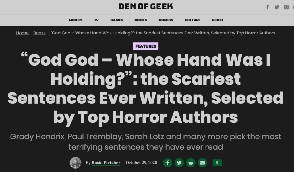 Scariest line ever! November 5, 2020November 5, 2020 According to a bunch of us, all of whom, you know, have different scary lines: https://www.denofgeek.com/books/the-scariest-sentences-ever-written/