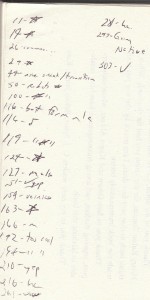 That many stars, for me, it’s very unusual. Usually my endpaper notes are littered with question marks and ellipses (these being the ellipses of dissatisfaction . . .) and just plain old X’s. Here, it’s like I’m trying to draw the night sky Sunny’s looking up into, trying to find her Maxon: it’s all stars.