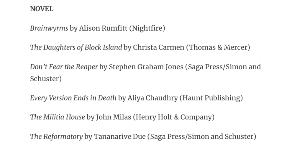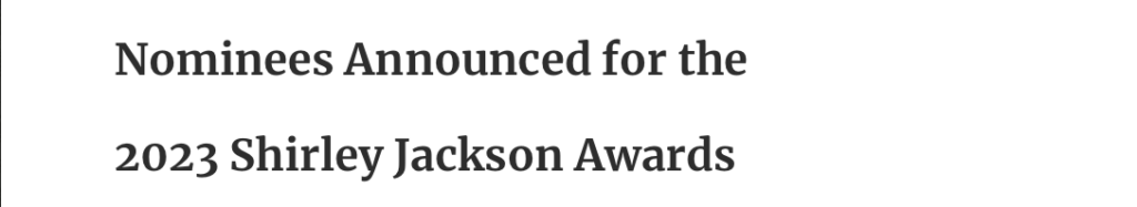 Shirley Jackson Award finalist! June 8, 2024December 9, 2024 So cool, such an honor: https://www.shirleyjacksonawards.org/2024/06/07/the-2023-shirley-jackson-award-nominees/