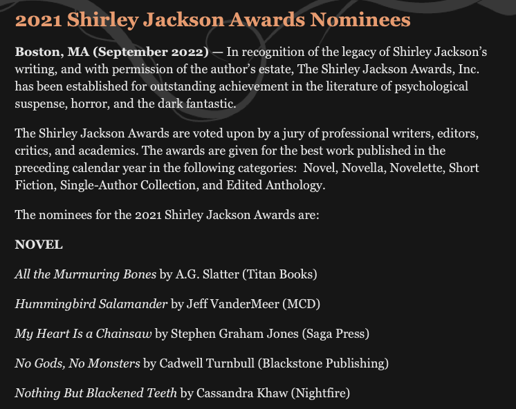 Shirley Jackson Awards 2022! October 3, 2022October 3, 2022 Amazingly, Chainsaw slipped into the final running. Up with some great books my amazing writers: https://www.shirleyjacksonawards.org/nominees/