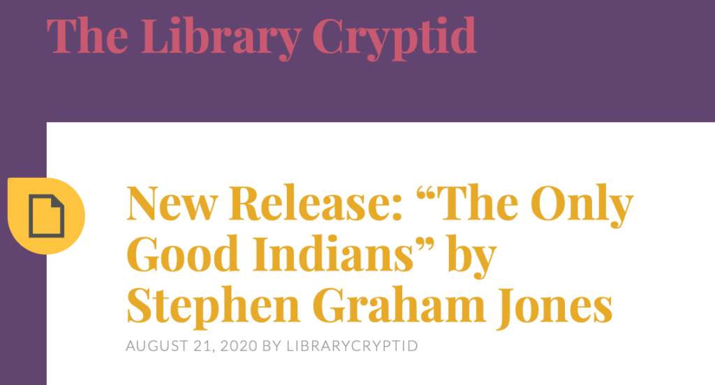 Some few elky reviews August 23, 2020August 23, 2020 http://www.themiddleshelf.org/reviews/stephen-graham-jones-the-only-good-indians https://www.ianwwrites.com/posts/the-only-good-indians-is-full-of-revenge-and-terror/ http://erinrockfort.com/blog/lightning-round-reading-challenge-week-33# https://librarycryptid.wordpress.com/2020/08/21/new-release-the-only-good-indians-by-stephen-graham-jones/ http://ivebeenreadinglately.blogspot.com/2020/08/retreating-from-everyday-horror-into.html