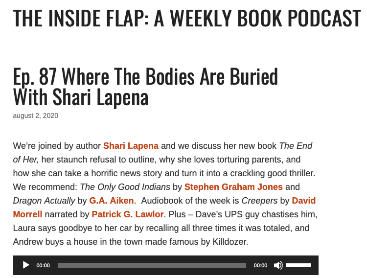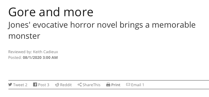 Some more elky write-ups August 7, 2020August 7, 2020 (as that last post was getting long . . . ) http://www.eggplante.com/2020/08/05/the-only-good-indians-by-stephen-graham-jones-review/ https://theinsideflap.com/2020/08/02/ep-87-where-the-bodies-are-buried-with-shari-lapena/ https://www.winnipegfreepress.com/arts-and-life/entertainment/books/gore-and-more-571969462.html https://bookriot.com/thought-provoking-horror-novels/