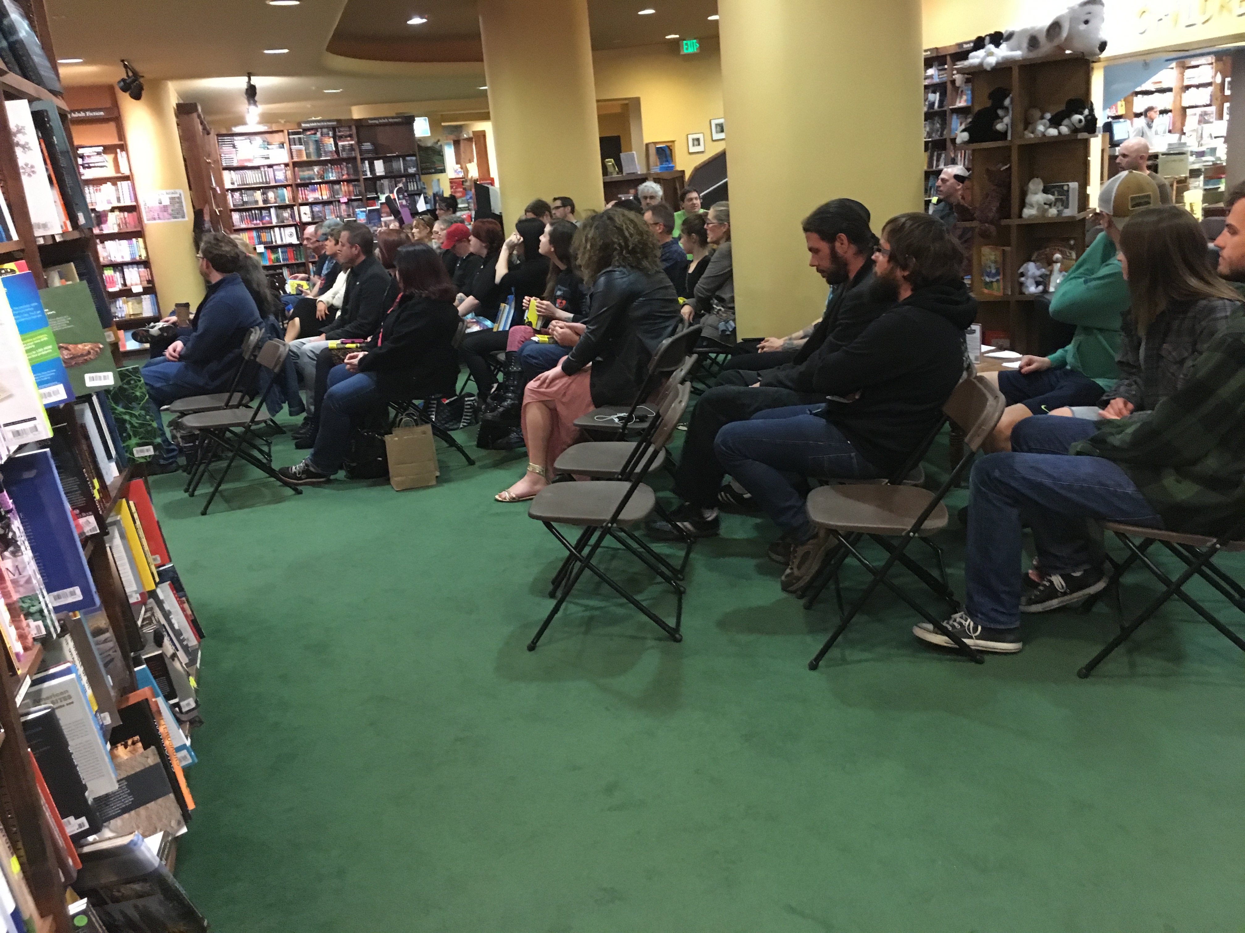 Was a great time: big crowd with a lot of questions. We never even got around to reading, just ended up talking to each other, fielding questions. Topics addressed ranged from David Lynch to advice to a twelve-year-old, and all points between. Here’s us digging deep into the world: