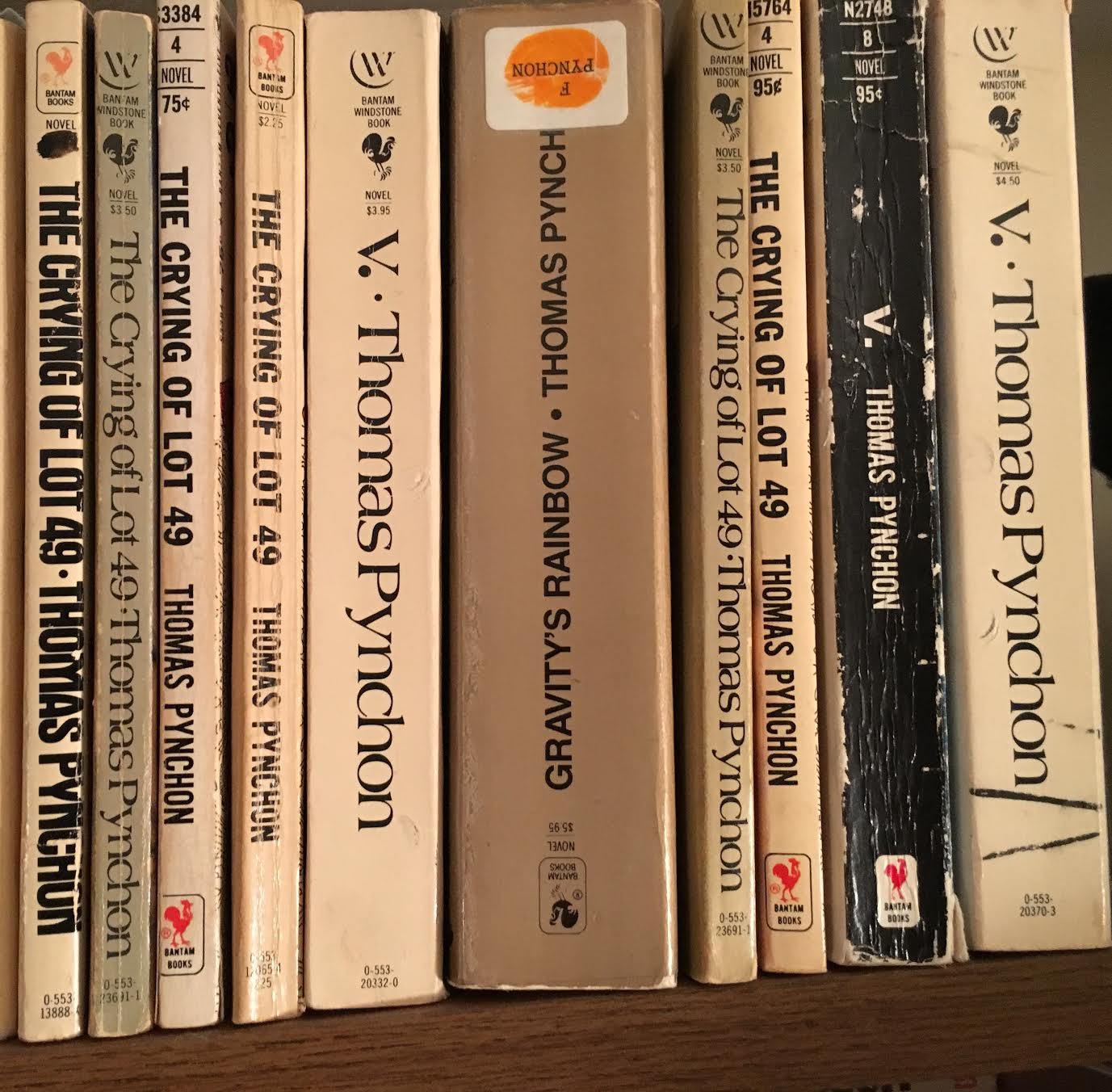But I love falling-apart paperbacks just as much if not more than I love the special-special editions (and yes, I’ve just now uprighted that Gravity’s Rainbow—it’s on a tall shelf, I hadn’t looked at it in a long time):