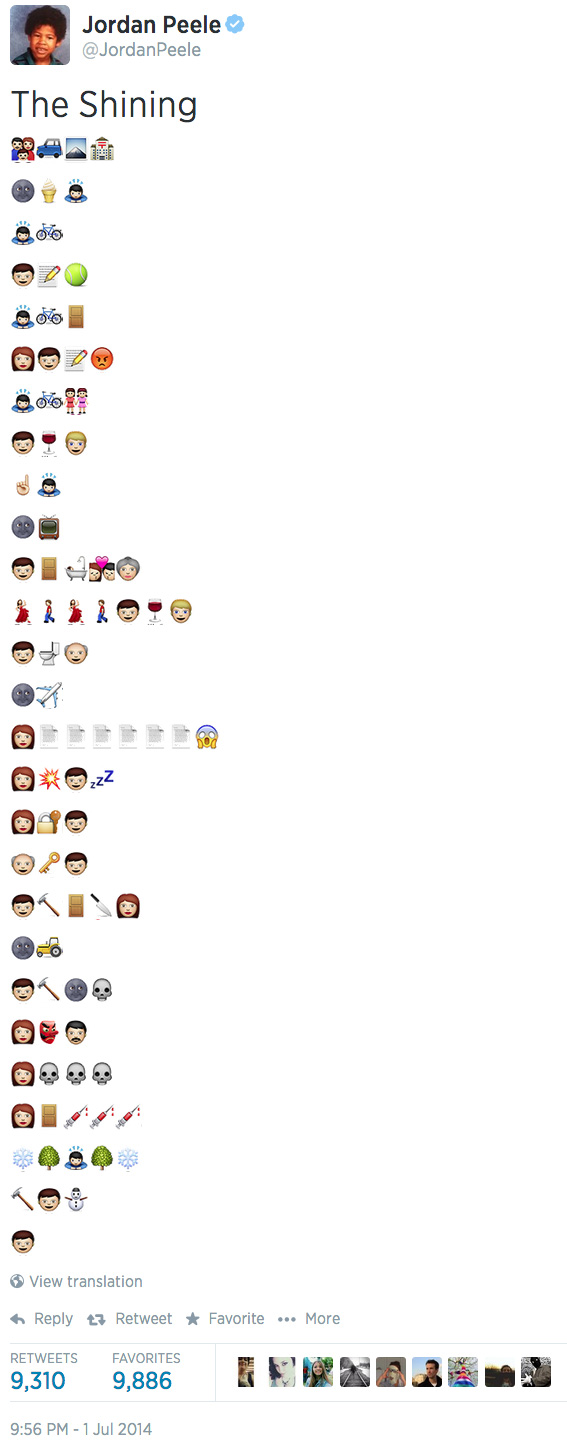 From forever ago, yes. But I’m just now stumbling onto it. And, is ’emoji’ the right word? Like, what are those little character-based happy faces people put in their texts? It’s all confusing to me. But this isn’t: The Shining, without words. Pretty cool. Wondering if I should learn whatever this language is (he said between telling kids to get off his lawn, yes), use it to diagnose slow points etc in whatever novel I’m writing. Like, if the skulls aren’t sprinkled evenly throughout, then I’m messing up . . .