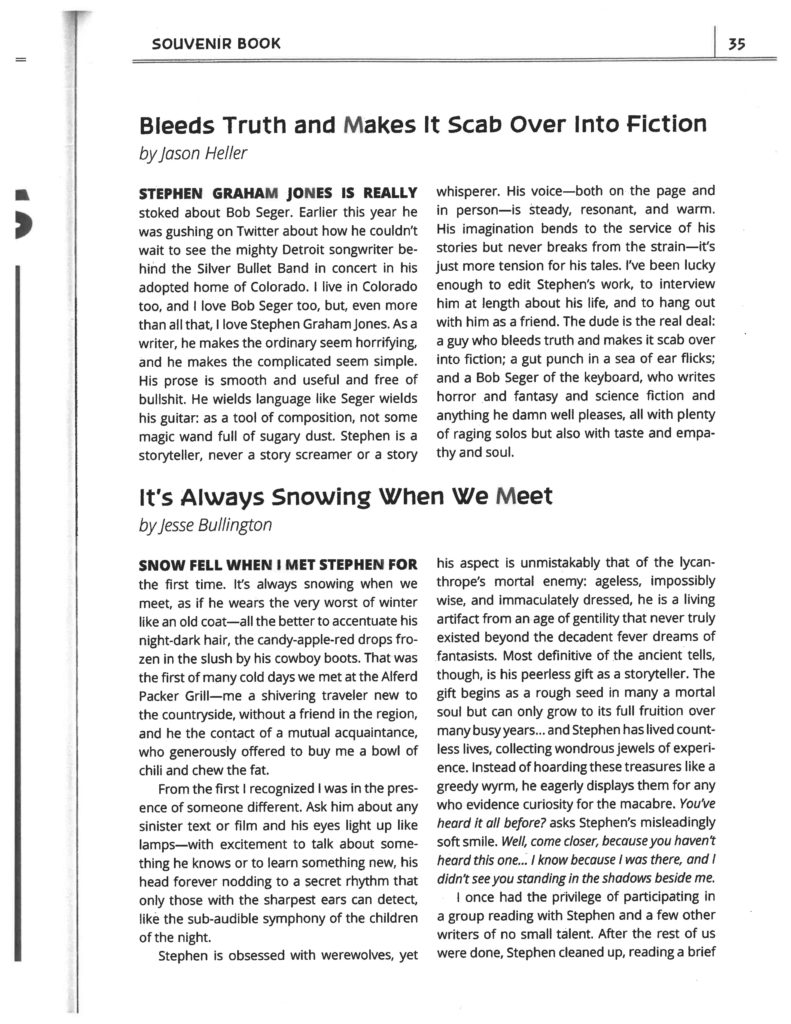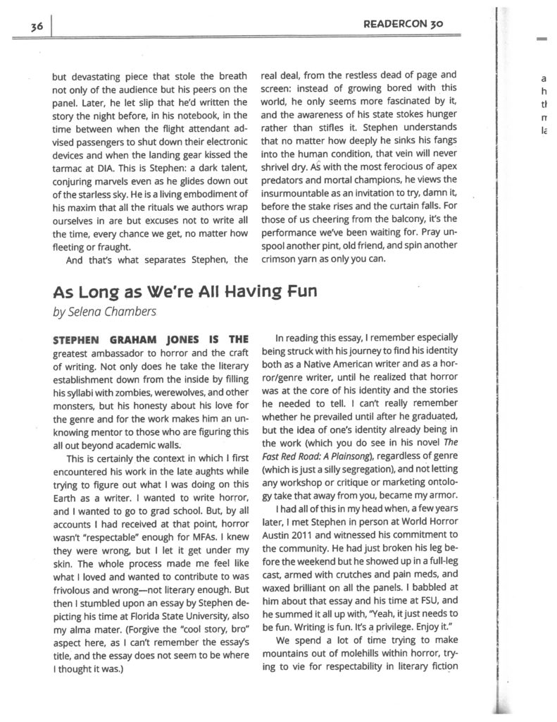 These fine words and art being first on that list. Thanks so much to ReaderCon for getting all this together in the souvenir book (along with “Werewolves on the Moon,” featuring art by Delicia Williams), and thanks to Jason Heller, Jesse Bullington, Selena Chambers, and Evan Cagle: