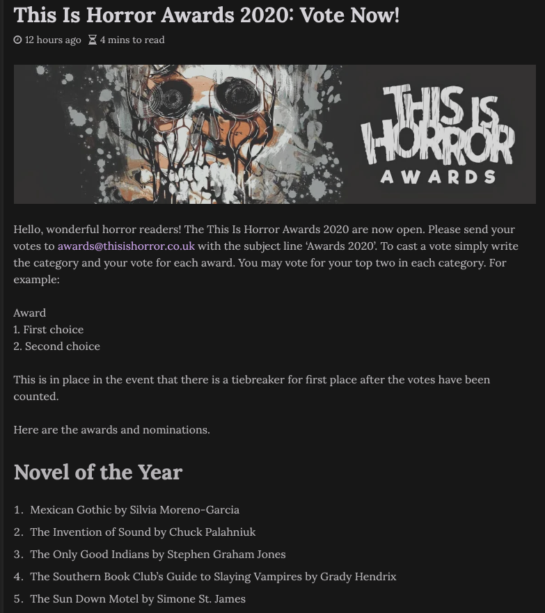This is Horror Awards final ballot! April 24, 2021April 24, 2021 Amazingcoolsuperhonor—vote now, vote often (but only after changing hats): https://www.thisishorror.co.uk/this-is-horror-awards-2020-vote-now/