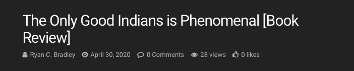 Three Elky Reviews May 8, 2020May 8, 2020 https://quirkycatsfatstacks.com/2020/05/05/review-the-only-good-indians-by-stephen-graham-jones/ https://thebookmistress.blog/2020/03/03/the-only-good-indians-stephen-graham-jones/ https://www.wickedhorror.com/horror-reviews/the-only-good-indians-is-phenomenal-book-review/