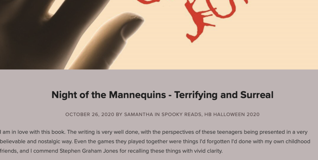 Three Mannequins Walk Into a Display Window: October 28, 2020October 28, 2020 https://thelibraryladies.com/2020/10/27/kates-review-night-of-the-mannequins/ https://www.horrorbound.net/blog/2020/9/30/night-of-the-mannequins-review http://www.errantdreams.com/2020/10/short-take-night-of-the-mannequins-stephen-graham-jones/