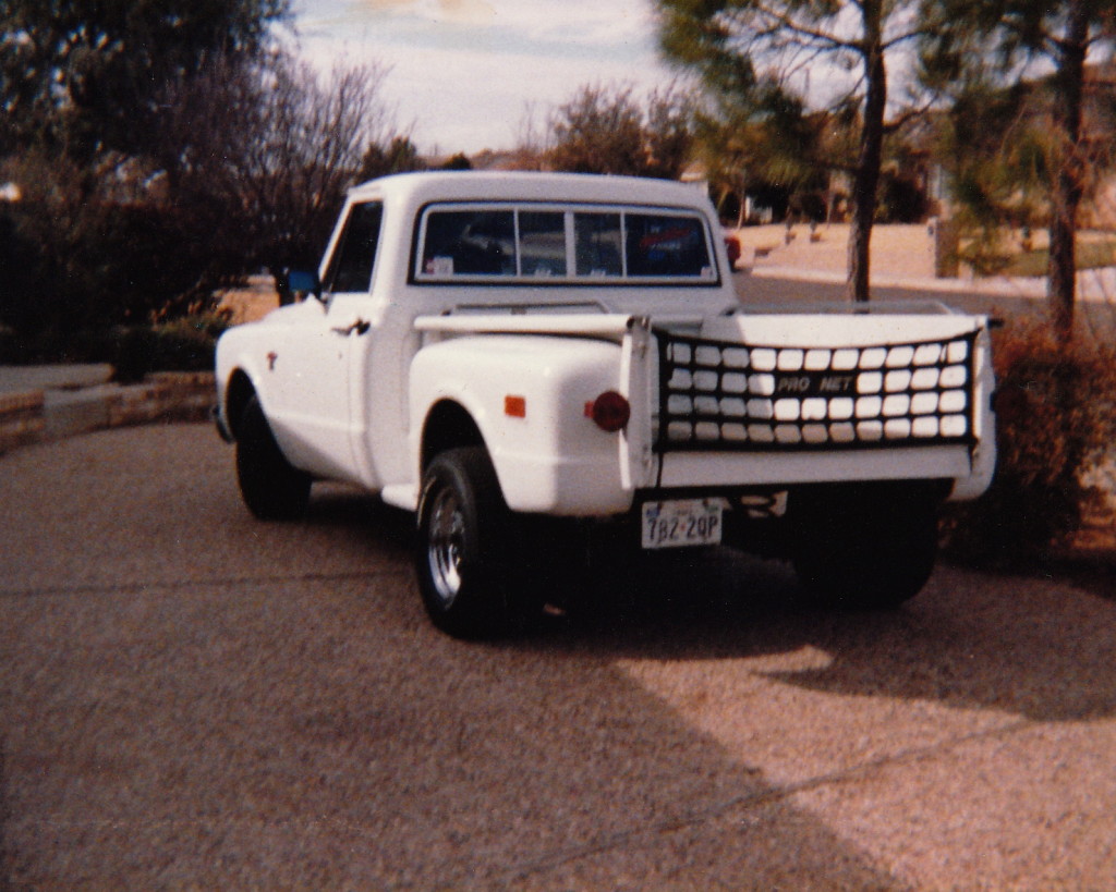 My grandfather co-signed the loan on this truck for me. A guy named Tom in Midland, Texas built it over a year or two. His first love was 442s, and he had a stable of them, but he wanted to see what a truck was like. And, for him, living with a truck the right way meant having the engine spread all over his kitchen and living room—his wife told me—and using fingernail paint to detail it out. Then hundred-dollar-a-quart airplane paint to put a nice hard shell on it. And, that engine? It was a 455 Hardin-Marine, lifted from a drag boat. A friend (Steve Woods) and me once loaded thirty-seven parking curbs into the little bed of this truck, to try to keep those fifties from spinning, but the rubber still broke loose. This truck would seriously get it. Except where Slowpoke was concerned. That was the name of the baddest truck in town—nearly the same year as this one, but a fleetside, with its name airbrushed on the tailgate, and a couple of nitrous tanks sitting back there at the proper angle, like the rockets they were. Guy named Eddie Vasquez drove Slowpoke. And of course I had to try to run him, up on Bluebird Lane (in Midland, Texas), before it got developed. He sucked me up. However, I won my share, too. Best race? It wasn’t even at night, but in the daytime, when some suit in a shiny-new 300Z pulled up alongside me on the loop. He popped the nose, I nodded sure, and then, for once, all the HP wrapped up in that Hardin-Marine found its way to the asphalt, and I was gone. Reason why? Blacktop’s sticky in the daytime, and I was running low-pressure. But, the races I lost: to my friend’s 64 Impala with a blueprinted 427; to my friend’s 67 (I think) Nova with a Vette engine in it; to my friend Scott’s gold Trans-Am. Scott’s job was pumping gas at the doctor and dentist airport, so, on weekends, his big 455 was always pumping high-octane airplane fuel. And he had a cam in that car that made it lope in a way I can still hear in a quiet room, if I remember jut right. It was the same way this white truck loped. Every 7-11 I would pull up to? The clerks would wave for me to kill the engine, kill the engine. Because my truck had enough bass in the exhaust to make that plate glass at the front of the store shudder and tremble. It was a serious ride, and more people knew that truck than knew me. Even had cops stop me in it—for all the usual reasons, of course, over and over, but sometimes just to look at it closer. Anyway, yes, there’s pics and pics of this truck. It was made to be photographed: